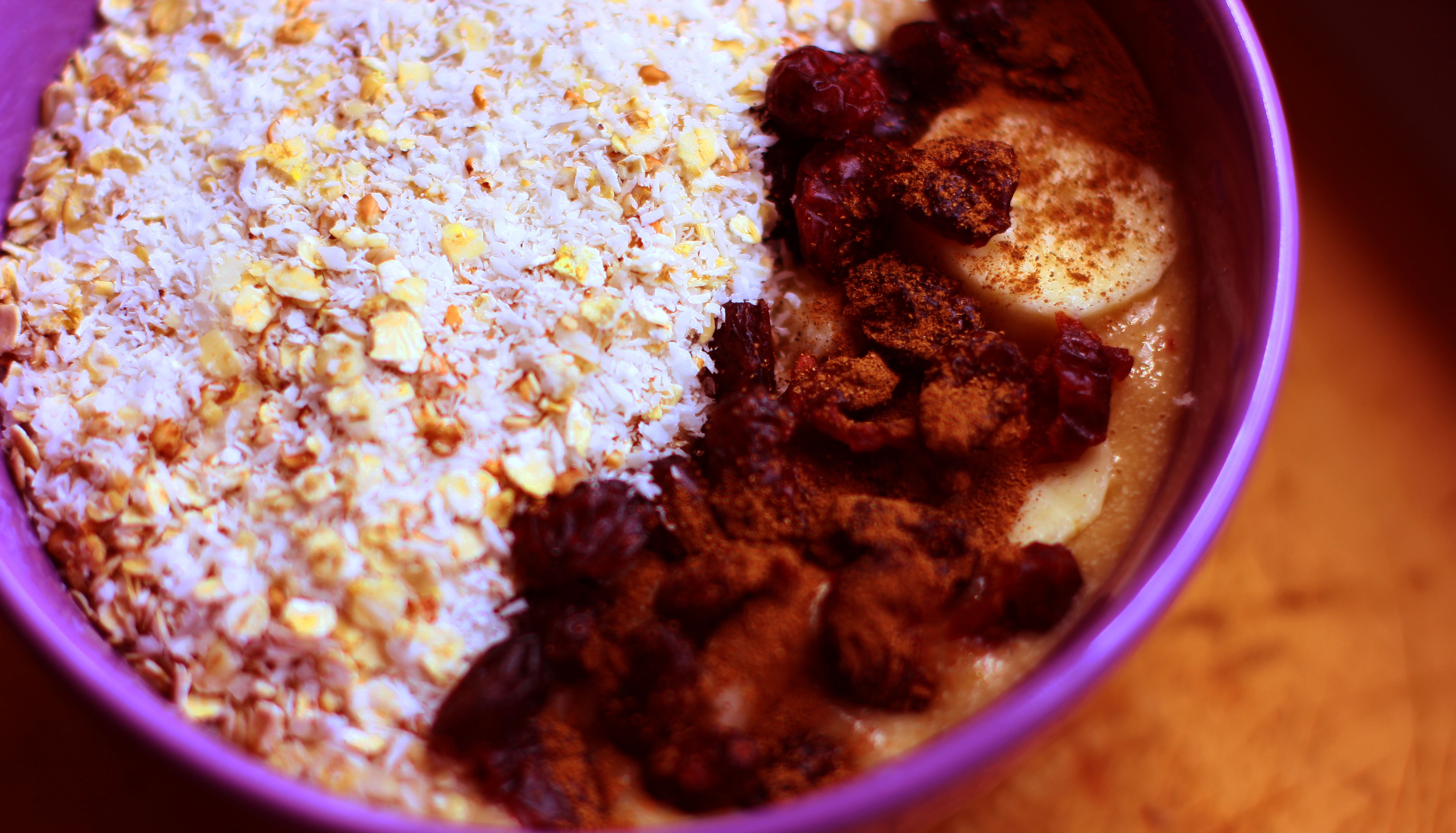 We use a blender to mix together the banana, the pear and the almond milk, then, when it all gets a creamy and smooth consistency, we are going to take it out of the blender and pour it into a nice looking bowl of choice and add the mix of drieds gruits and nuts, the coconut flakes and we can also add some more banana slices, dried cranberries and cinnamon for an even more filling and more tasty dish.