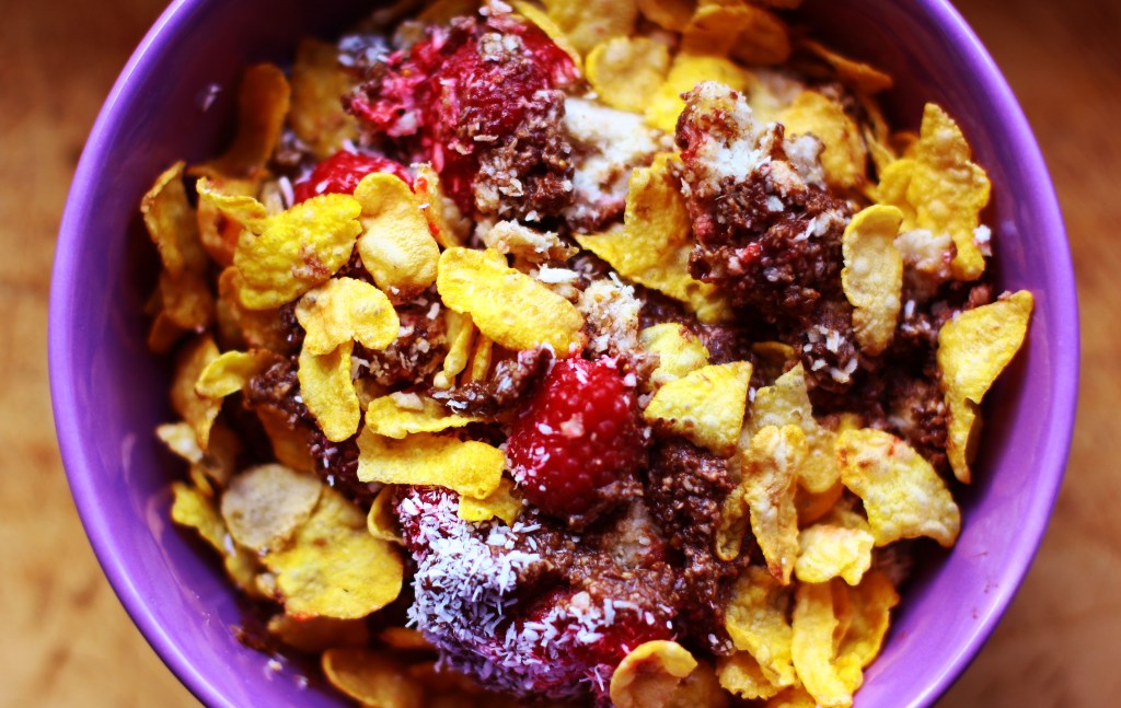 We use a food processor to mix all the ingredients together until we get a sticky and thick consistency. When it is ready, we can take it our of the food processor and mix it with some cereal flakes of choice. I used fome corn flakes for mine. Then we move on to the next step.