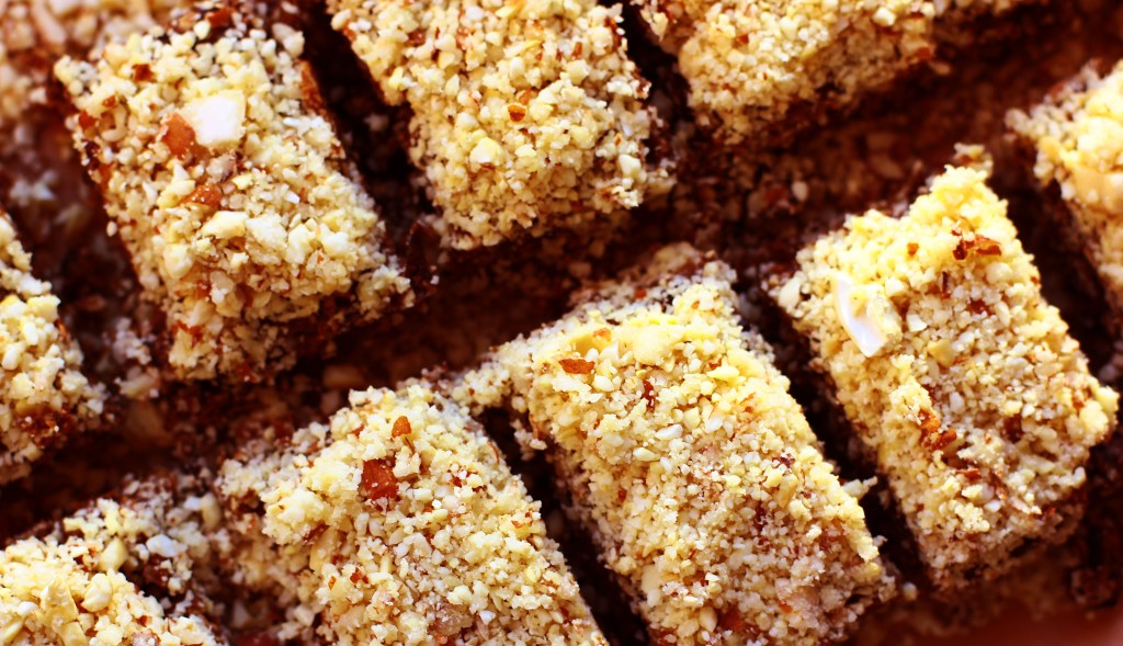 We use a food processor to mix all the ingredients for the bars together and mix until we get a thick and sticky consistency. When it is ready, we can take the mixture out of the food processor and make our bars. We can sprinkle some more chopped almonds or even cashews on top for even more crunchiness, and then all we need to do is place our delicious brownie bars into the fridge for 1-2 hours, or we can just serve them right away. They are such a great and energizing snack and they are so healthy and fulfilling that they can even be served for breakfast. Yum!