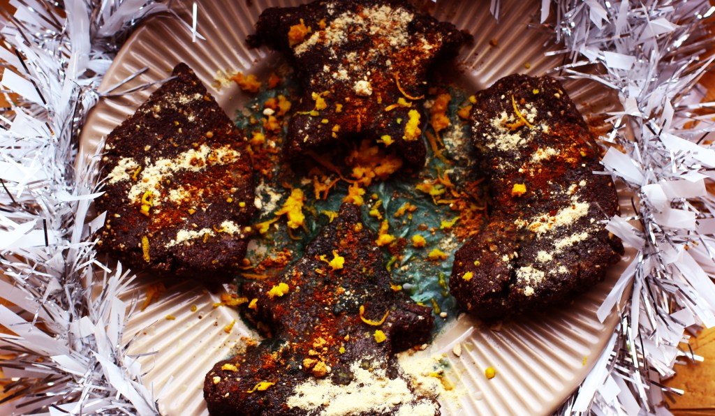 We use a food processor to mix all the ingredients together until we get a sticky and thick consistency. When our cookie dough is ready, we can take it out of the food processor and start making our cookie shapes by using a cookie cutter or just simply by hand. When the cookie shapes are ready, we can sprinkle them with some more maple syrup and add some macca powder, orange zest and guarana powder on top. Then we have two options from here right on: we can allow them to sit into the fridge for a while in order to firm up or we can dehydrate them for a more crunchy texture, more like the traditional ones, baked in the oven. Of course, the cookies can also be served right away. If so, their texture will be just a little bit gooey and soft, but the taste, still divine!