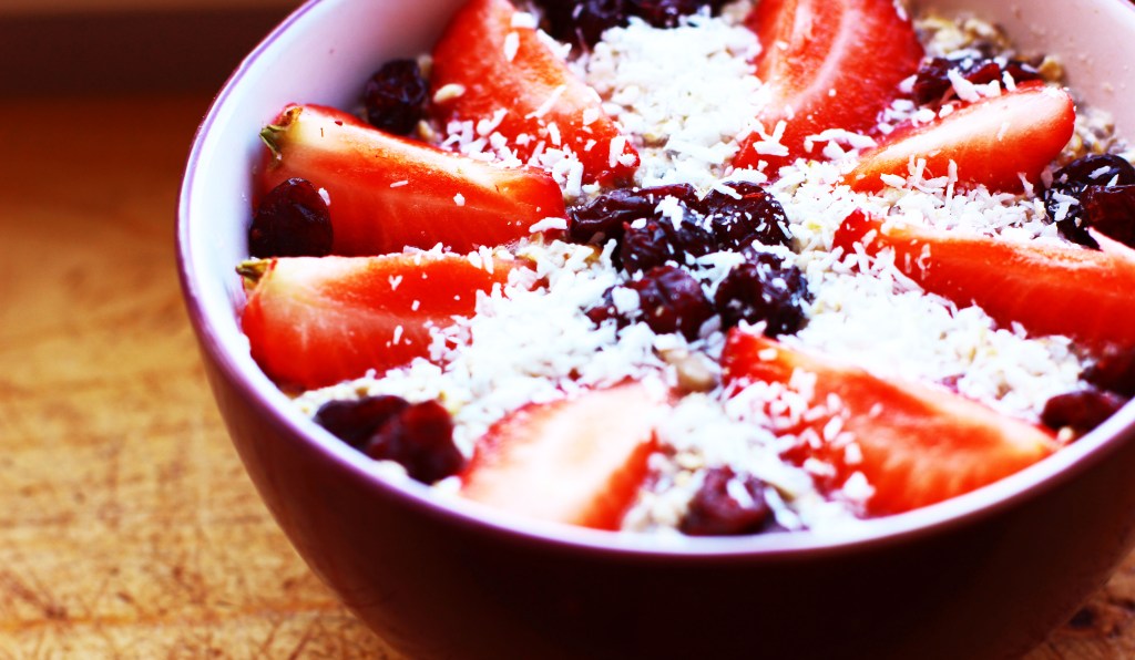 Today`s recipe is a super delicious and nutritious mix of strawberries and oat flakes, with a gentle touch of cranberry goodness and coconut sweetness. Yum. This recipe is a great and nourishing way to start out our days energized and ready to accomplish all of our most beautiful desires and dreams.