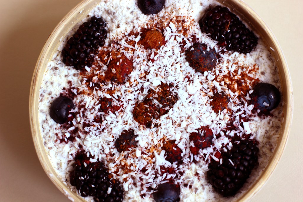 This recipe is also great as it does not require any other kitchen equipment to be made, just a spoon and a bowl, and magic is ready to be done. We are going to bring together into a bowl of choice the coconut, milk, chia seeds and coconut flakes, and mix them well until we get a thick, pudding like consistency. Then, when the pudding is ready we can also add the berries and sprinkle some cinnamon on top of it. If you want to boost it even more, feel free to add on top of the pudding some aronia powder as well. It will taste absolutely divine. Also, please feel free to add any healthy sweetener of choice if you desired, I just found out lately that with the sweetness of the berries, I do not really need any extra sweetness.