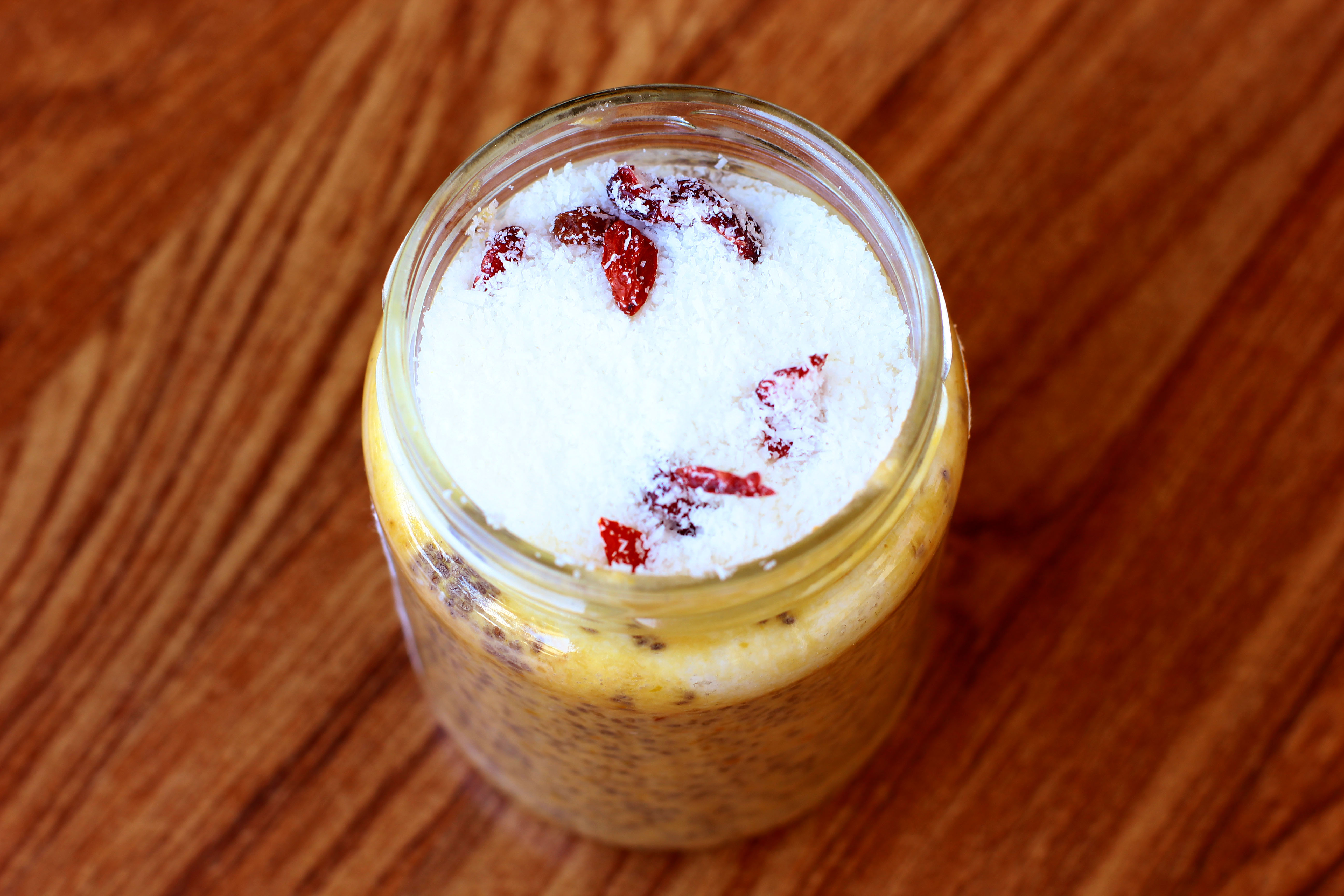 coconut flakes, mix of goji berries and cranberries to top our delicious pudding.