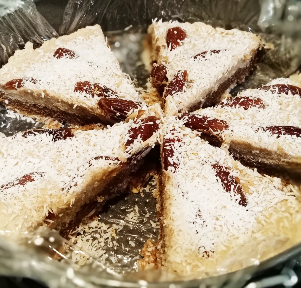 Finally we add some more coconut flakes and sprinkle them on top of our cake and if we wish so, we can also add some halved dates for even an even more good looking cake.
