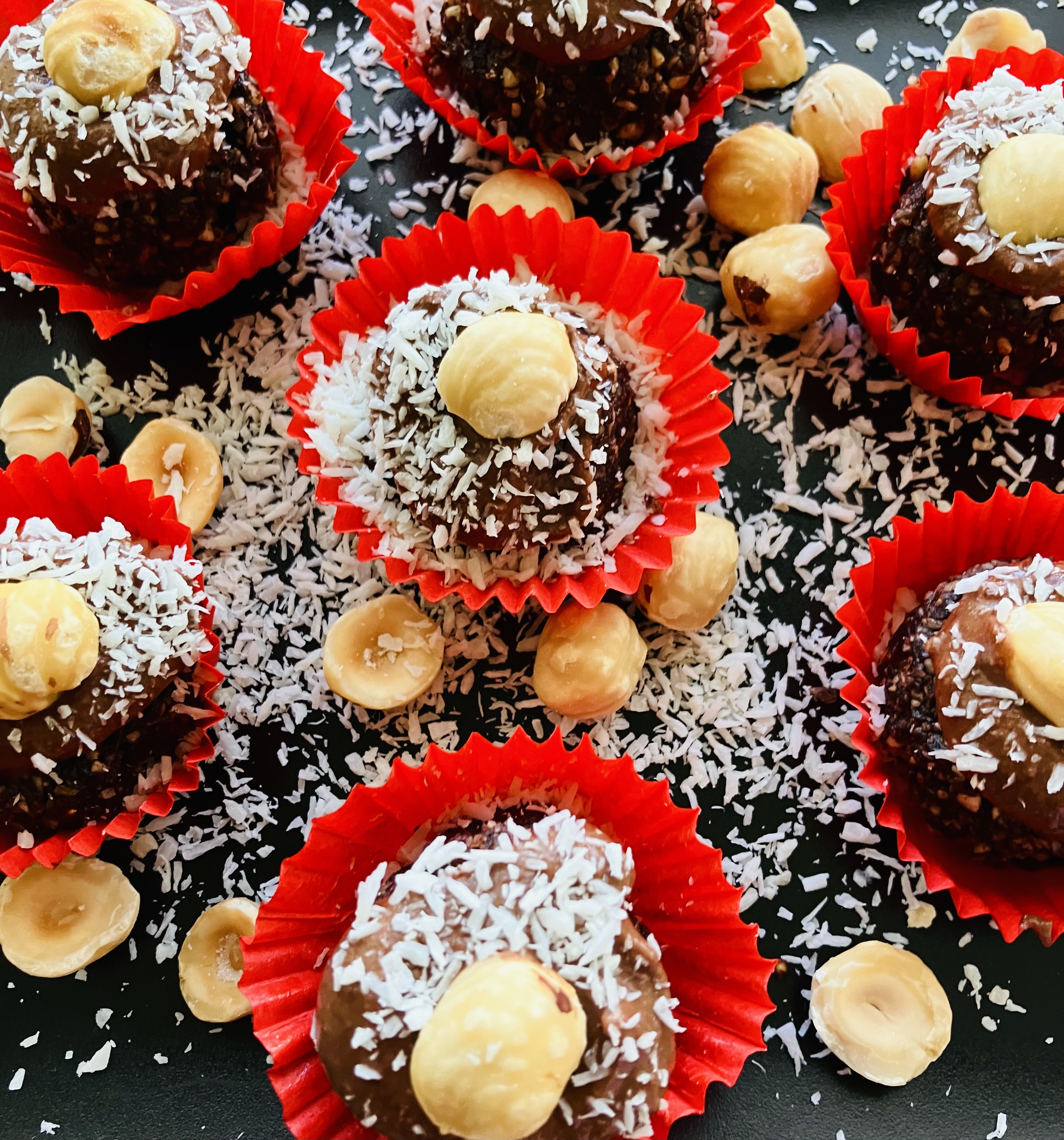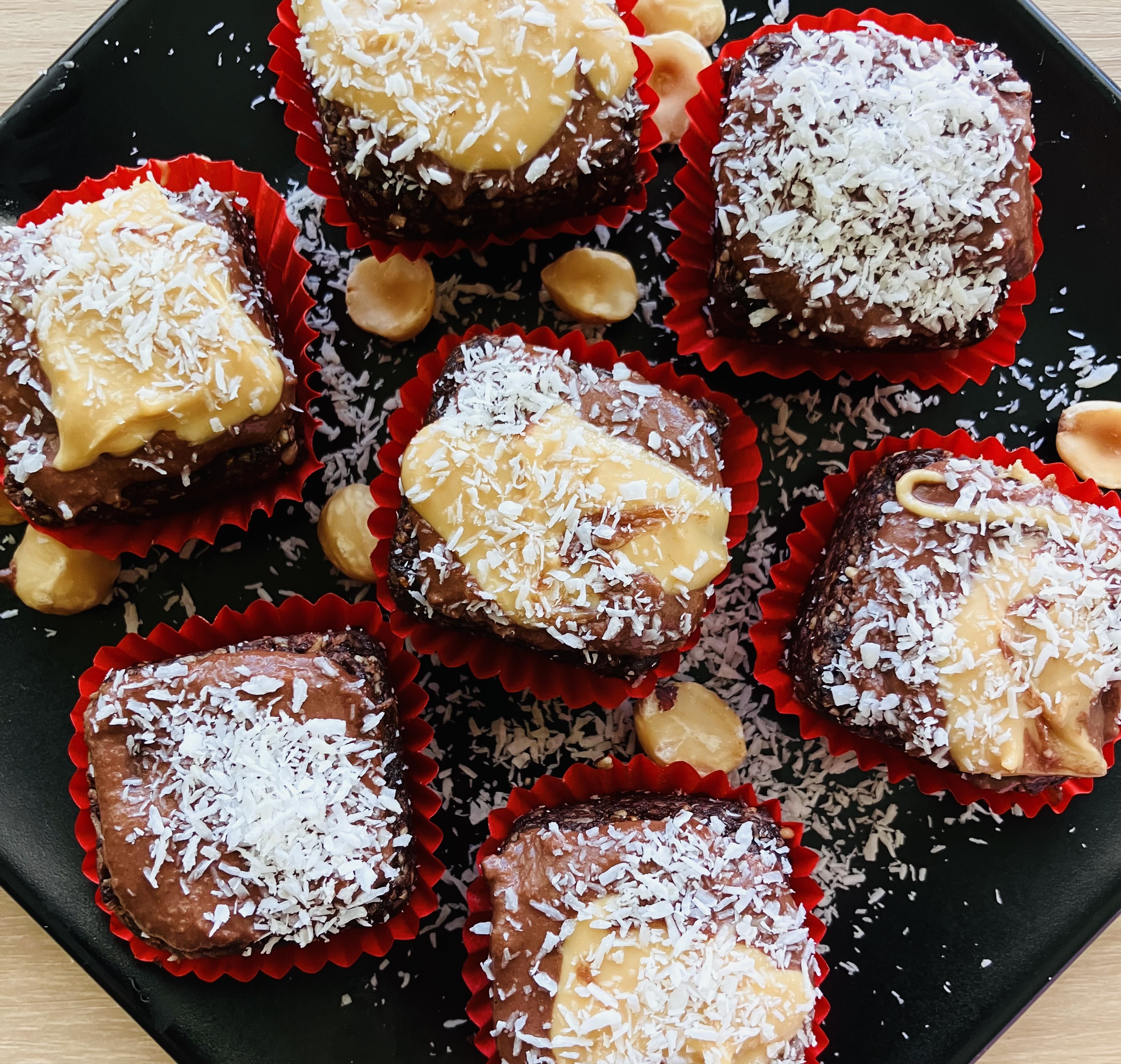 Last but not least we can add some extra toppings like grounded or whole nuts, I used hazelnuts, coconut flakes, cacao or carob powder or any other things that you might want to sprinkle on top of your own brownies. As always, feel free to get inspired, improvise and find what best fits your own preferences and taste buds. These delicious goodies can be served right away, or they can also kept in the fridge for latter serving for up to a few days.