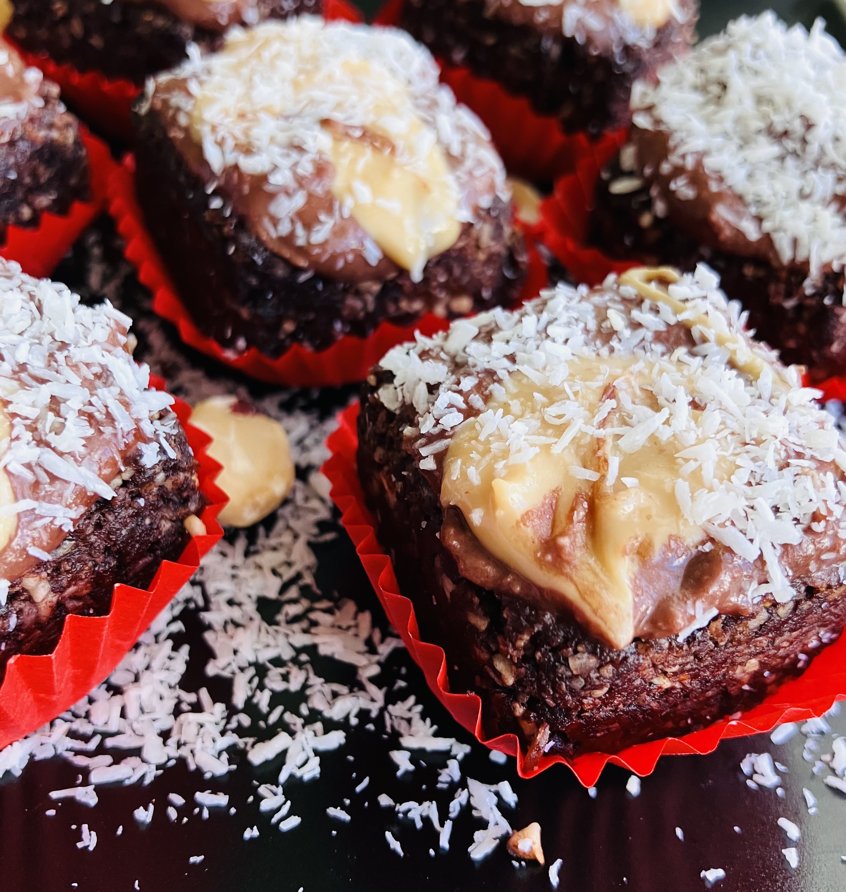 We mix the ingredients into a blender until we get a smooth and creamy consistency, which we then either roll our brownies delicious and nutritious balls through, or we just spread it on top of the brownie squares.